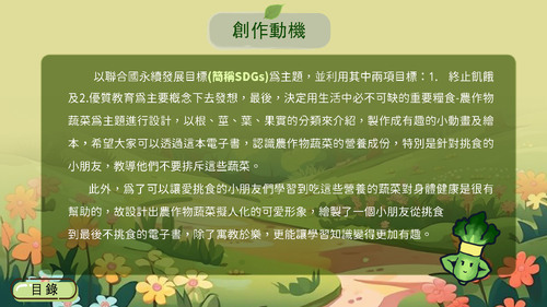 我們想製作一個使用繪本風格來呈現的電子書,在跟老師詢問主題意見時,老師提議可以用聯合國永續發展目標(簡稱SDGs)為主題,以其中兩項目標終止飢餓及優質教育為主要概念下去發想。
